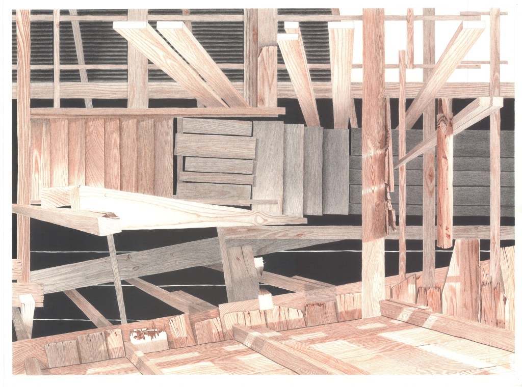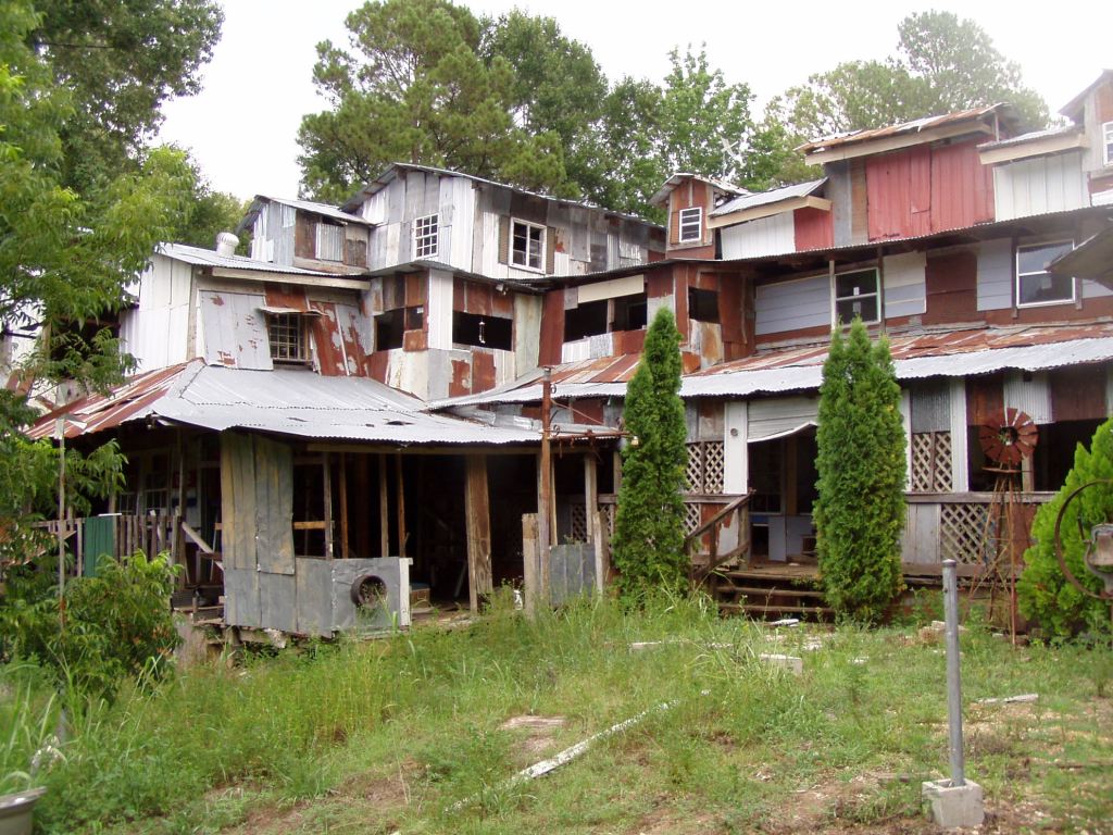 The image in meditation #25 Substances, not volumes, and here (see figure 6) are student attempts to capture the baroquely layered complexities of Earl’s Art Shop – folk artist Earl Simmons home/studio/gallery/juke joint outside Bovina, Mississippi – in a single drawing (figure 7 shows the front façade of the second incarnation of Simmons’ home no longer extant). These drawings avoid the emptiness of space and abstractness of volumes in space without falling into the trap of technological myopias (drawing details) or pragmatic resignation (floor plans and building sections). Both Kyle Stribling (figure 5) and Daniel Perschbacher (figure 6) render the spatial complexity and atmospheric quality of place via faces, edges, and vertices because these are the primary building blocks of experiences of surfaces.