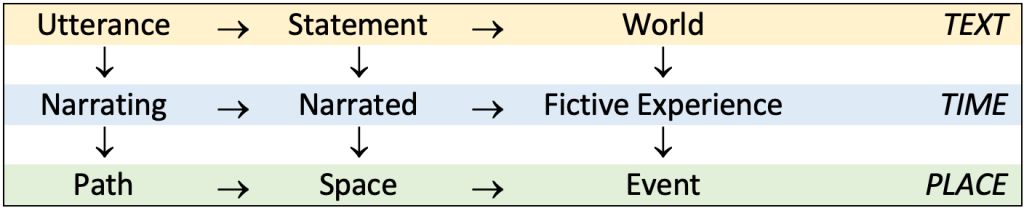 Paul Ricoeur is a philosopher I turn to often in these meditations. His Time and Narrative is a must read for architects, in my opinion. At the moment, I am particularly interested in his elaboration of the differences between “the time of narrating” and “narrated time.” From this distinction, originally introduced by Günther Müller and extended by Gérard Genette, he identifies “a three-tiered scheme: utterance-statement-world of the text, to which correspond a time of narrating, a narrated time, and a fictive experience of time.”[i] My simple diagram attempts to locate these interrelations of time and text.