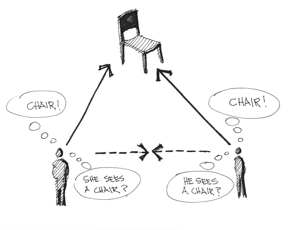 Fourth, a note on affordances and knowledge. Affordances, understood as complementarities of animals and environment relative to the animals, provide some foundation for a theory of shared or social knowledge. Here I am specifically thinking of philosopher Donald Davidson. At the heart of Davidson’s conception of knowledge, which acknowledges “membership in a society of minds,” is his notion of triangulation: we must know others’ thoughts to know our own, we must know our own thoughts to evaluate others’ thoughts, and we must share a world and its values to evaluate each other. All three aspects are required or shared common knowledge is impossible. The connections from ourselves to the world as well as from others to the world are rooted in affordances (see figure 13). And like Gibson’s theory of affordances, Davidson’s three-part theory of knowledge eschews objective-subjective or quantitative-qualitative dilemmas.[iii]